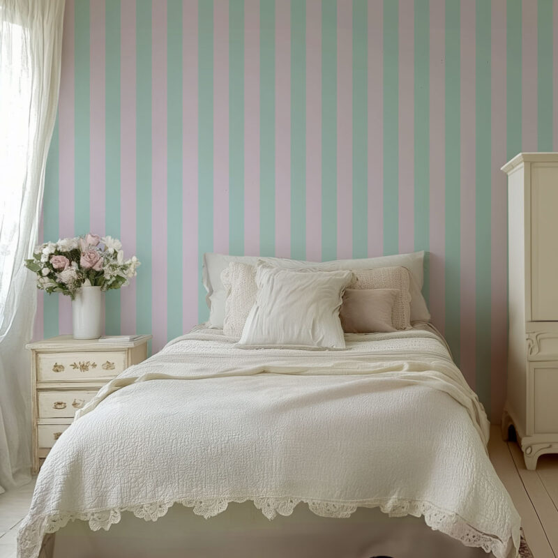 This vertical striped wallpaper features shades of pastel green and light pink. This combination creates a serene and modern atmosphere in a child’s room, a teenager’s room, or any other living space. Available in wide stripes (9 cm) or narrow stripes (5 cm), the Amande design from our Poudrée collection adapts to all your decorating needs, bringing a trendy balance to your interior.