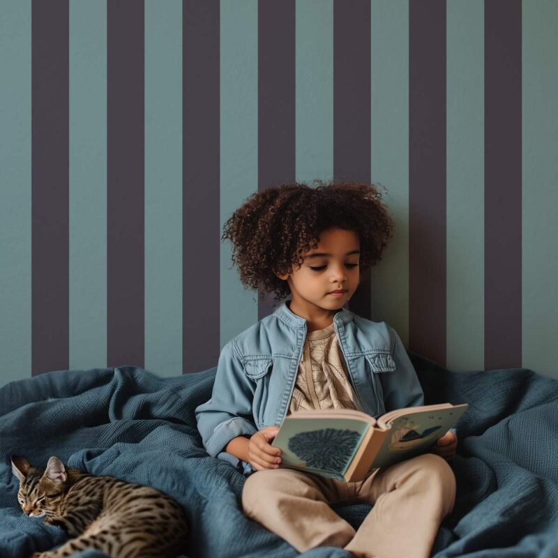 The Amazonite wallpaper gently blends vertical stripes in blue-gray and tonka tones, making it ideal for personalizing your spaces. Its contrasting hues make it a perfect choice for creating a cozy haven in a child’s bedroom. Part of the Impériale collection, this design is available in two widths: wide stripes (9 cm) or narrow stripes (5 cm).