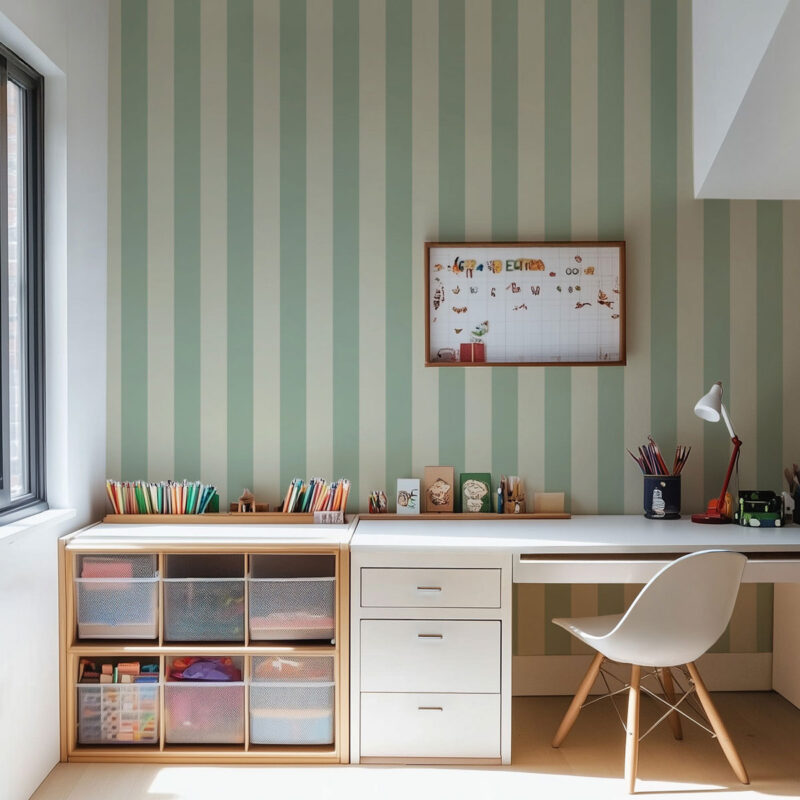 The Jade wallpaper stands out for its vertical stripes in shades of green, one of which is slightly lighter. This subtle contrast adds depth to the wall while maintaining a beautiful visual harmony. A deep green, both natural and bold, that catches the eye without overwhelming the space. This wallpaper is part of our new Tones on Tones collection. It adds just the right amount of energy to your interior, bringing rhythm to the walls and real personality to the room. Ideal for a living room, this wallpaper is available in two versions: wide stripes (9 cm) or narrow stripes (5 cm).