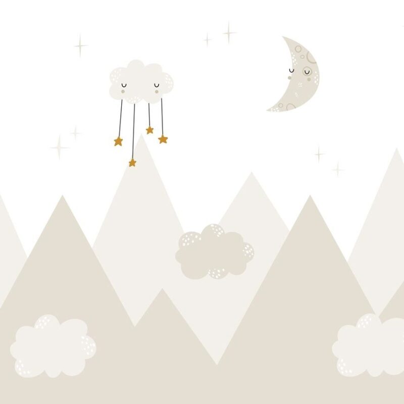 Create a soothing and gentle atmosphere in your baby’s room with our Beige Mountain wallpaper. This graphic, contemporary design features a range of beige shades—from dark to light—to create subtle depth and a serene atmosphere. Stylized mountains take shape with elegance, while playful moons and clouds float above, adding a touch of magic and lightness.