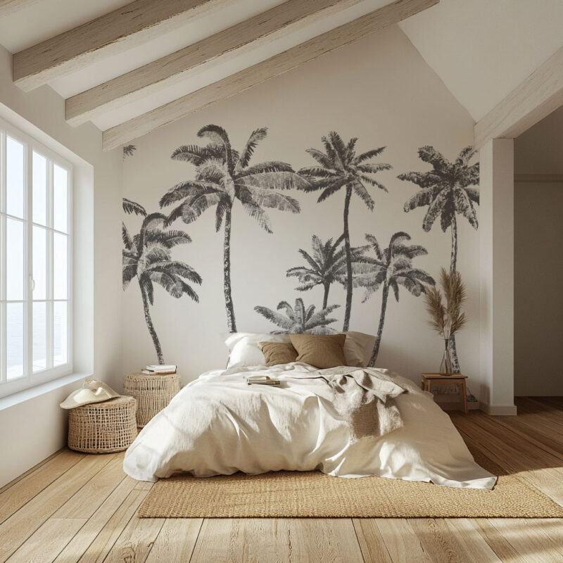Add a touch of sophistication and freshness to your home with our Black and White Palm Tree wall mural. This minimalist and elegant design plays on black-and-white contrasts to create a chic, contemporary summer vibe. The majestic palm trees stand gracefully, creating an atmosphere that is both soothing and dynamic—perfect for a master bedroom, a teenager’s room, a living room, or an office.