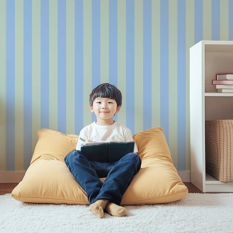 This striped wallpaper combines light blue with pastel green for a soft, soothing look. Its harmonious color palette makes it a sophisticated choice for a child’s room, a teenager’s room, or any other living space. Available in wide (9 cm) or narrow (5 cm) stripes, this vertical pattern visually elongates the walls and adds rhythm to the space. This wallpaper adds a splash of color, perfect for creating a decor that is both original and balanced. An ideal choice that will adapt to your decorating preferences.