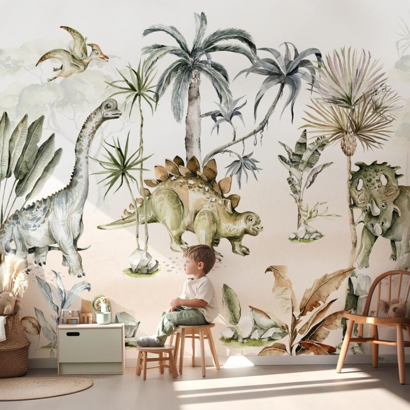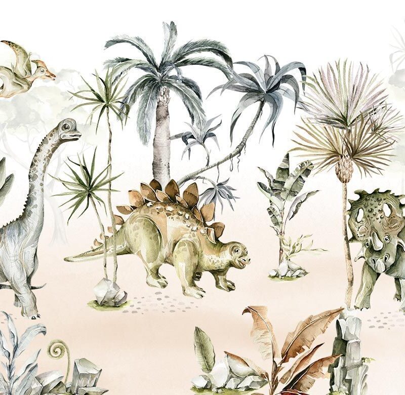 Transform your son’s bedroom into a true prehistoric sanctuary with our Exotic Dinosaurs children’s wallpaper. This panoramic wallpaper, featuring a warm palette of terracotta, beige, and green, transports young explorers to a fascinating world populated by majestic dinosaurs.