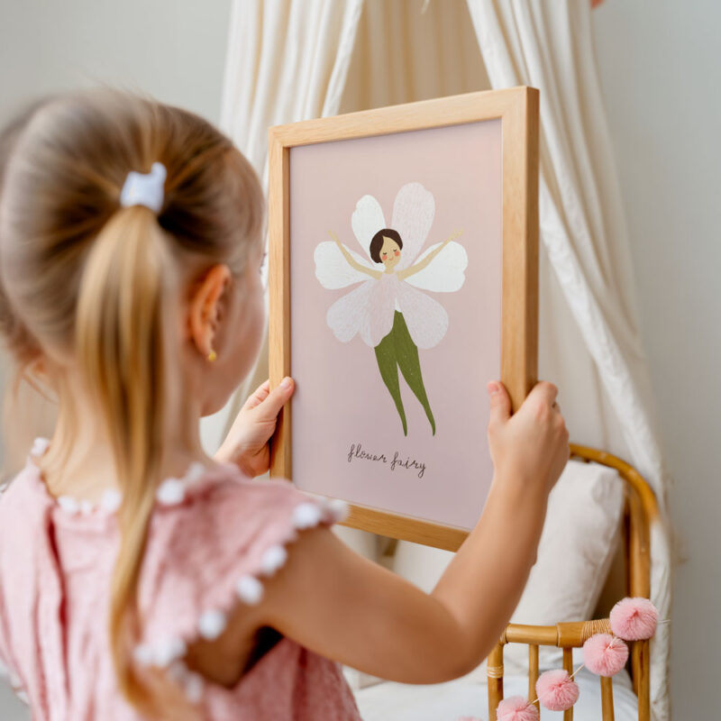 A touch of magic floats in the air with the Flower Fairy poster. Against a delicate pink background, a little flower-shaped fairy spreads her wings, as if stepping out of a child’s dream. Her tender and poetic world invites gentleness and imagination. Perfect for a child’s room, whether for a little girl or boy, this watercolor illustration adds a magical touch full of charm and delicacy.