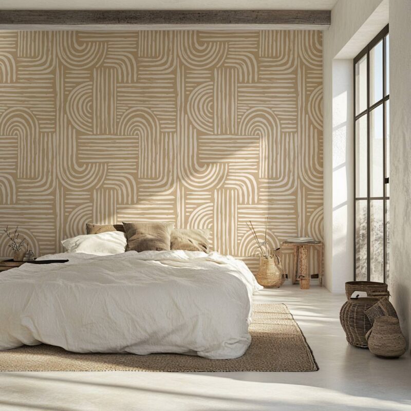 This graphic wallpaper blends beautifully into a minimalist, design-oriented, or Scandinavian decor, and works equally well in a bedroom, living room, office, or entryway. Its interplay of lines adds depth to the walls, while maintaining a natural, easy-to-match color palette.
