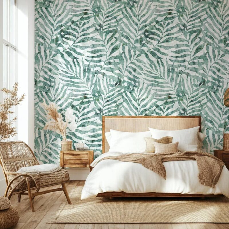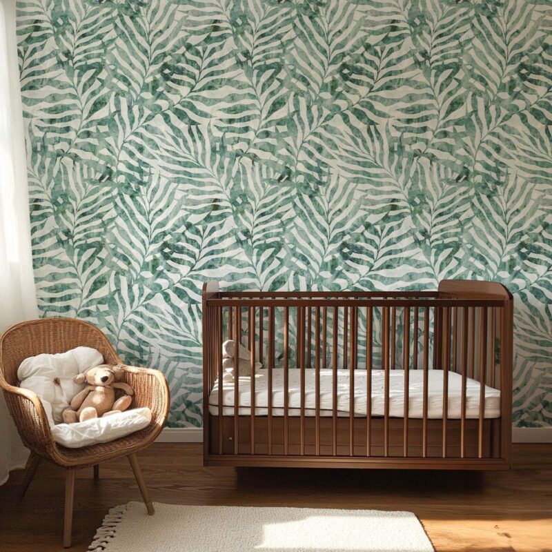 Available in shades of green and mint blue, this foliage wallpaper fits perfectly with many interior styles. It works just as well in an elegant, natural adult bedroom as it does in a soothing children’s room or a bright, modern living room.