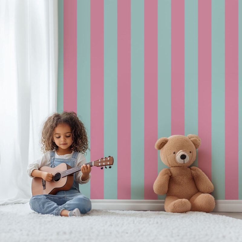 This vertical striped wallpaper combines a light turquoise green with a soft pink, creating a contrast that is both refreshing and energetic. This vibrant color duo will add a touch of liveliness to any room in your home, from the children’s bedroom to the master bedroom. The harmonious blend of these shades energizes the atmosphere while maintaining a subtle balance. Available in wide stripes (9 cm) or narrow stripes (5 cm), it adapts to your preferences for a modern and original decor. This wallpaper enhances every space, bringing freshness and character. A bold choice that combines style and personality.