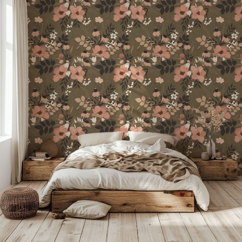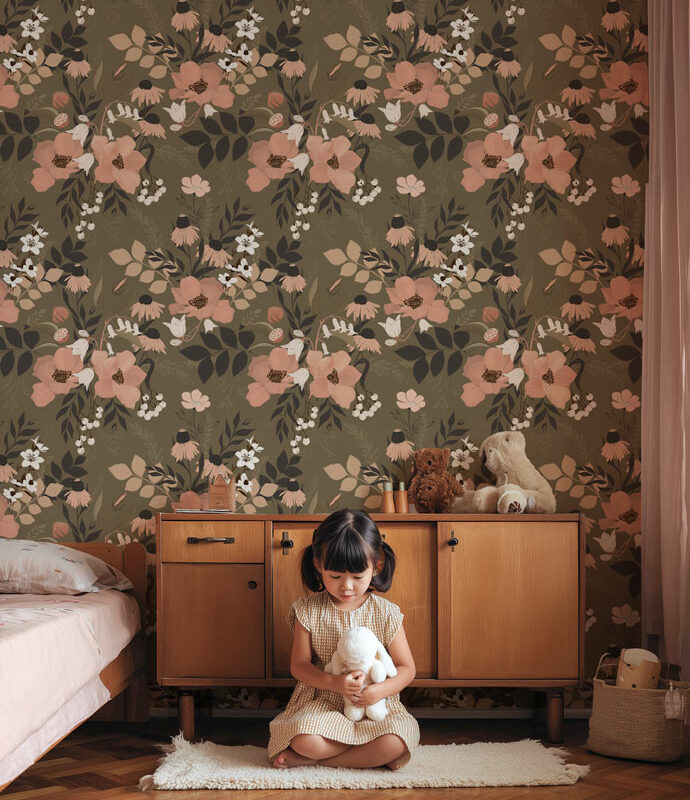 Dress up your walls with elegance using our Fleurs Kaki floral wallpaper, a timeless design that brings charm and sophistication to your home. Its delicate patterns of pink and white flower bouquets stand out subtly against a khaki-green background, creating an atmosphere that is both warm and sophisticated.