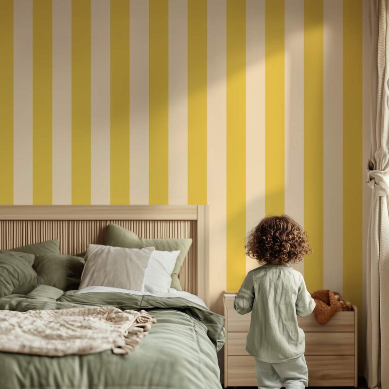 The Laure wallpaper, from our Tones on Tones collection, features vertical stripes in two shades of yellow: a soft pastel and a deeper hue. This subtle contrast creates a pattern that is both colorful and trendy, perfect for adding a touch of vibrancy to your spaces. Available in wide (9 cm) or narrow (5 cm) stripes, it fits seamlessly into a bedroom thanks to its bright and balanced style.