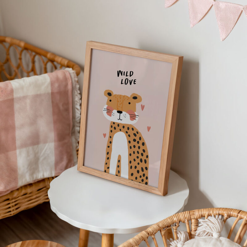Add a touch of character and charm to your child’s room with this lovely watercolor poster featuring a little leopard on a pink background, accompanied by the inscription “wild love.” Its style, both gentle and wild, will charm little animal lovers. Perfect for an original and charming wall decoration, this illustration will bring a warm touch to a child’s bedroom, a play area, or a nursery. Carefully crafted in France, this poster also makes a wonderful gift idea—whether for someone else or for yourself.