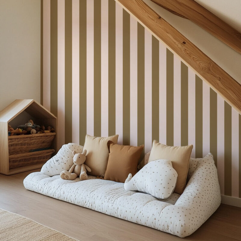 This vertical striped wallpaper combines a dusty khaki with a light cream beige, creating a soft yet subtly contrasting look. Its natural color palette adds a contemporary touch without overwhelming the space. Available in narrow (5 cm) or wide (9 cm) stripes, this design works equally well in a child’s or teenager’s bedroom, as well as in a living room or home office. Its simple pattern suits any decor, from classic to the most modern. Part of the "Nude" collection, this wallpaper elegantly frames the wall while remaining easy to coordinate. A safe choice for a refined and timeless decor.