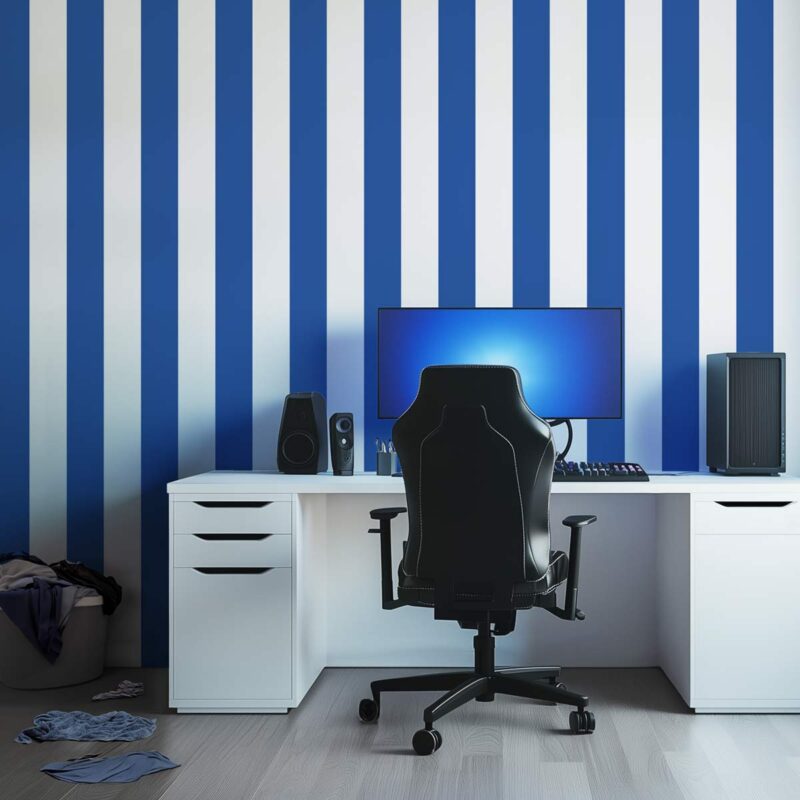 Discover the Myrtille wallpaper, a standout new addition to our "Vitaminée" collection. Its vertical stripes combine an intense midnight blue with a brilliant white. This wallpaper creates a striking and luminous contrast with its colors, offering a bold and timeless aesthetic to your spaces. This wallpaper is ideal for energizing a space and adding structure to a room, creating a remarkable sense of height thanks to the vertical stripes. It’s a perfect choice for a child’s room, a teenager’s room, or an office, for example, where it will add a touch of bold character. Available in two distinct sizes—with wide stripes (9 cm) or narrow stripes (5 cm)—this wallpaper adapts to all your preferences for a personalized look.