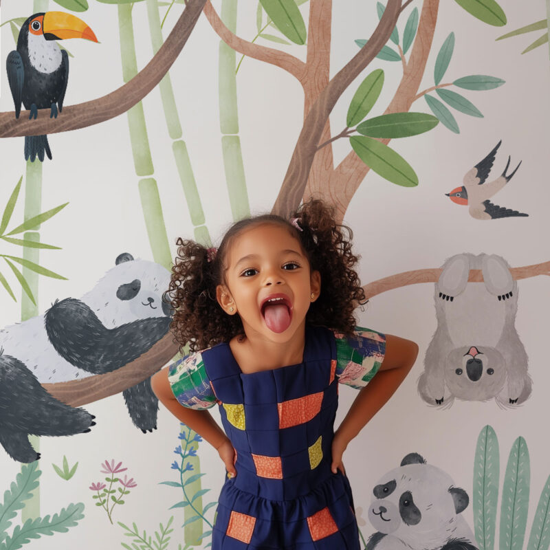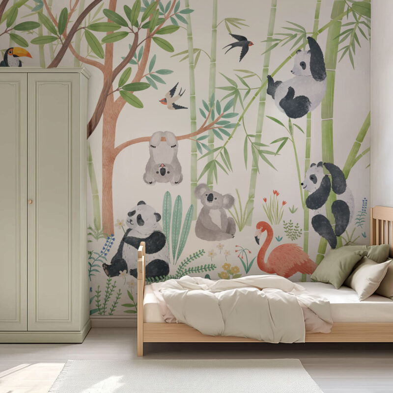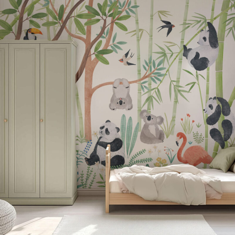Step into an enchanted world with the "Panda Paradise" panoramic wallpaper. In the heart of a lush jungle, playful pandas climb bamboo trees while cuddly koalas rest peacefully. An elegant flamingo adds a splash of vibrant color, surrounded by fluttering birds and exotic foliage. This soft and soothing design creates a warm and welcoming atmosphere, perfect for fostering imagination and serenity in a child’s or baby’s room.