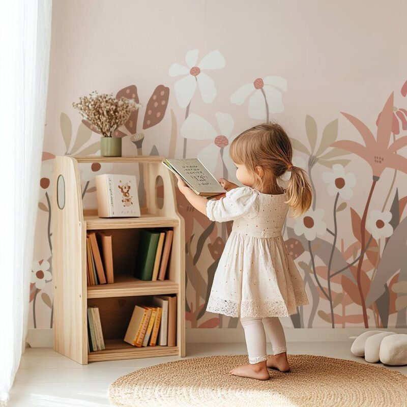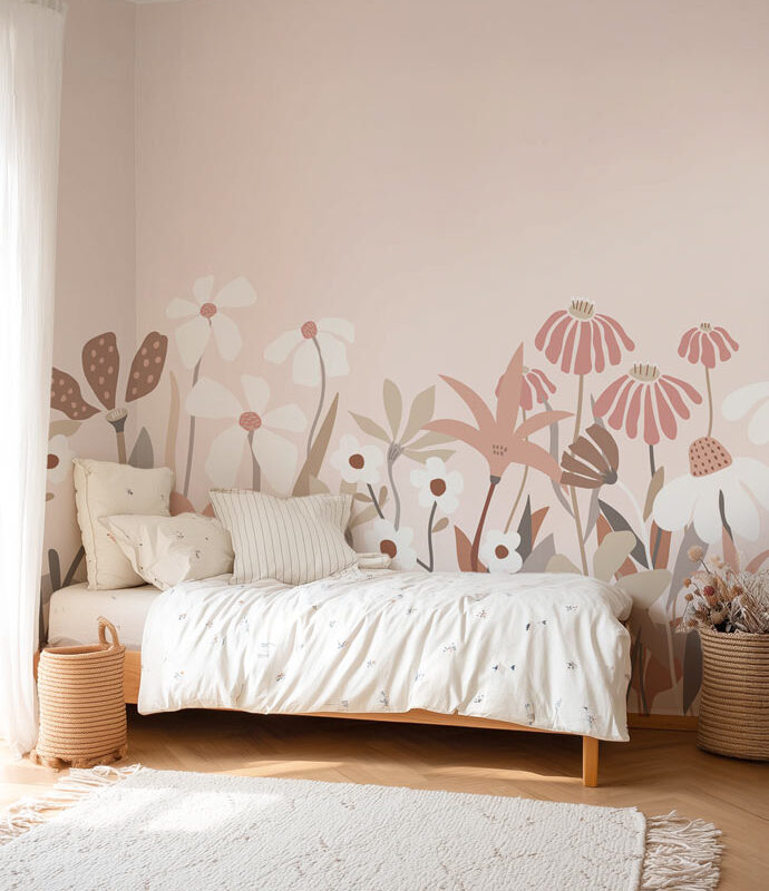 A delicate and versatile wallpaper, perfect for creating a warm, floral, and charming atmosphere in a child’s or teen’s bedroom.