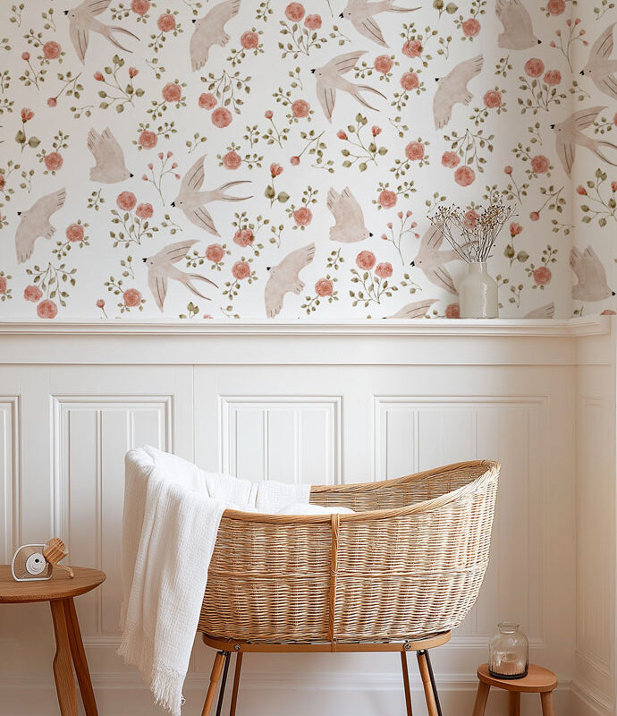 Let the magic happen with this delicate wallpaper, where graceful swallows flit among blooming roses and delicate leaves. A true invitation to daydream, full of softness and lightness, it brings a soothing and poetic atmosphere to your child’s room.