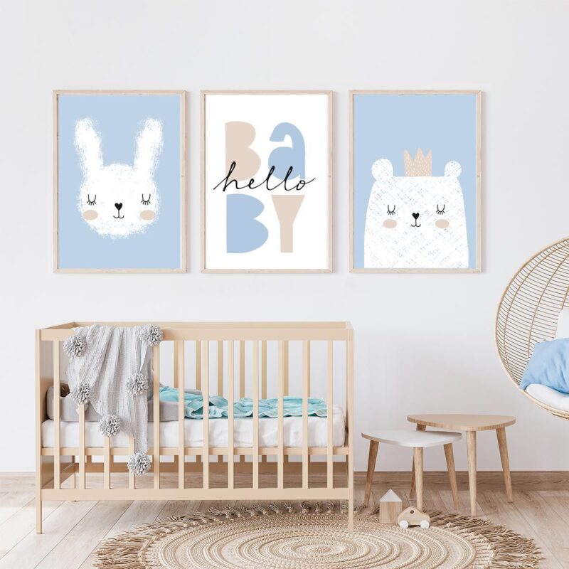 Set of 3 blue “Hello Baby” posters for boy’s room
