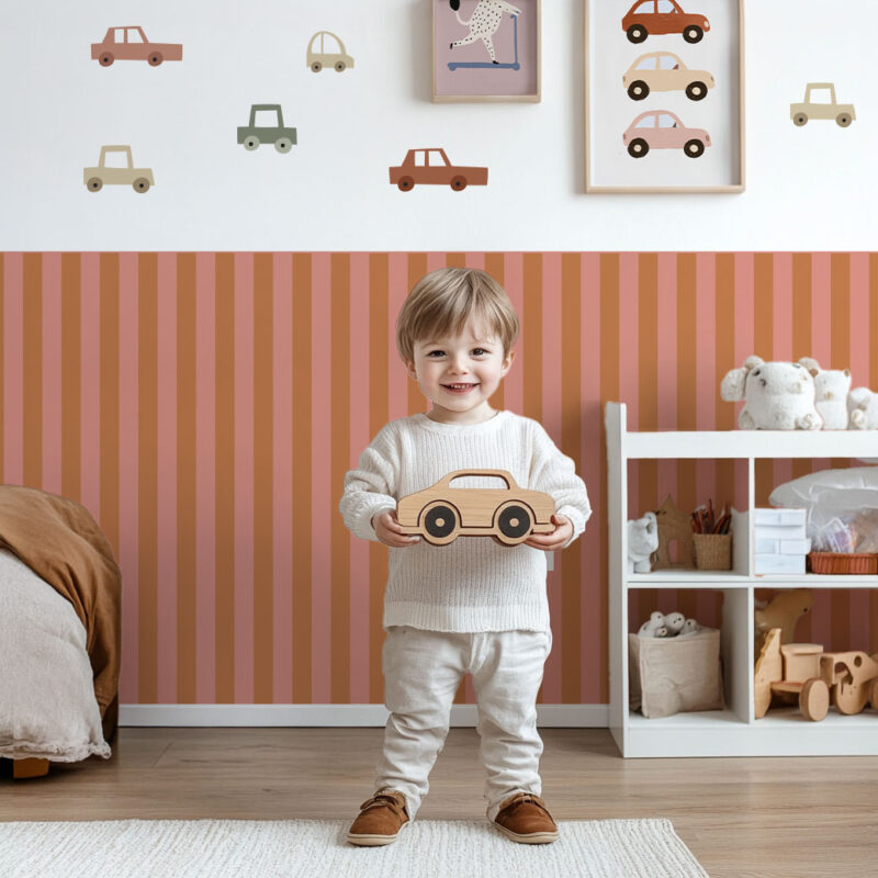 Bring warmth and softness into your home with the Terre de Sienne wallpaper from our Nude collection. Its vertical stripes in shades of light brown and powder pink create a cozy atmosphere in any room, while adding a touch of vibrancy. This wallpaper fits perfectly in a teen or child’s bedroom, a living room, or an office. It is available in two versions: with 9 cm wide stripes or 5 cm narrow stripes, allowing you to customize the stripes to suit your decor preferences.