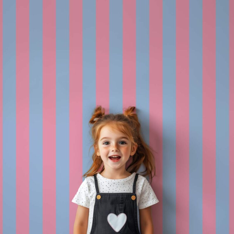 This vertical striped wallpaper combines a light blue with a rich pink, creating a harmonious blend with sweet accents. A vibrant color palette, perfect for bringing joy to a child’s or teenager’s bedroom. Available in wide (9 cm) or narrow (5 cm) stripes, this design adds structure to the space while bringing real personality to your walls. Perfect for brightening up your home. This wallpaper from our Poudrée collection suits all interior styles. A true colorful favorite that won’t go unnoticed!