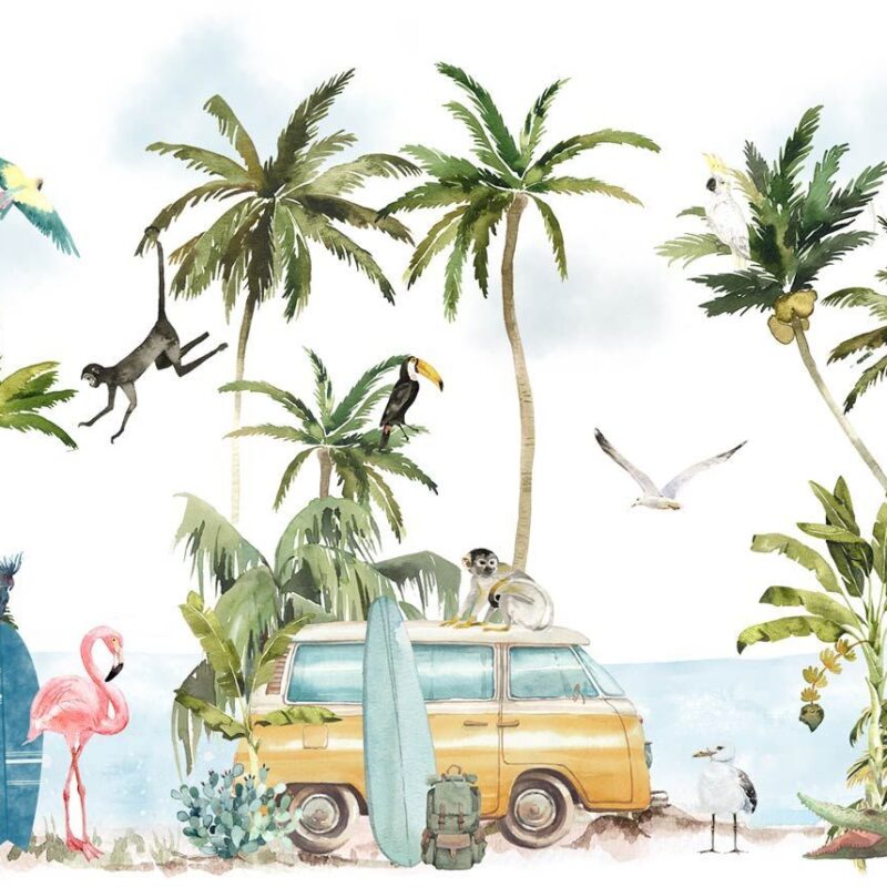 Transform your home into a true summer postcard with our Summer Vibes panoramic wallpaper! Let yourself be transported to the tropics, surrounded by majestic palm trees, a sparkling blue ocean, and golden sand. The atmosphere is decidedly sunny, punctuated by the flight of seagulls, the silhouette of an elegant flamingo, and even the presence of a discreet crocodile enjoying the exotic setting. A surfboard resting on the beach invites you to escape and dream of endless waves.