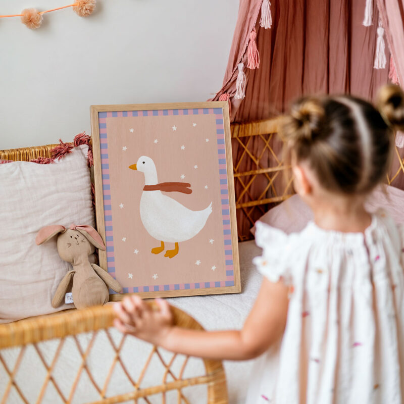 Add a touch of poetry and softness to your little girl’s room with this lovely watercolor poster featuring a tender, dreamy goose against a pink background dotted with tiny stars. The pink and purple striped frame adds a whimsical and refined touch, perfect for creating a soft, magical, and warm atmosphere. Ideal for decorating a wall above the bed, a dresser, or a reading nook, this illustration invites daydreaming and pairs beautifully with a pastel or romantic decor.