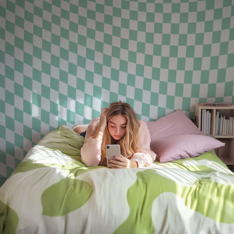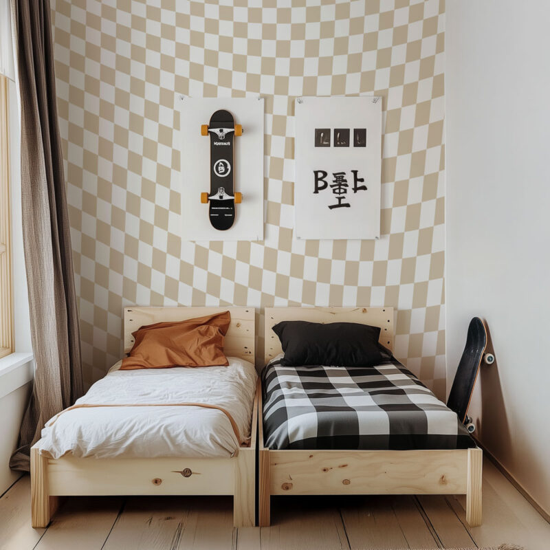Small pattern designs, stripes or checkered motifs, like this one, are custom-made to fit your wall. They are not standard rolls.