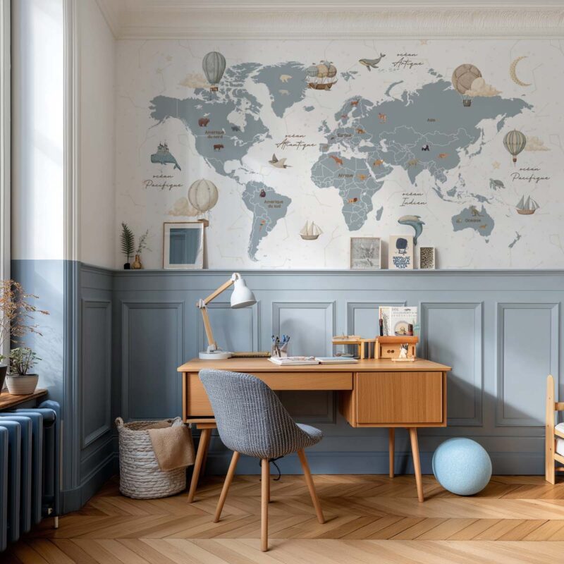 Around the map, charming sailboats and hot air balloons float in the air, while whales and sea creatures come to life in the ocean, creating a poetic and playful contrast. Every detail is designed to spark curiosity, stimulate the imagination, and invite children to discover the world and its wonders, from the starry sky to the depths of the sea.